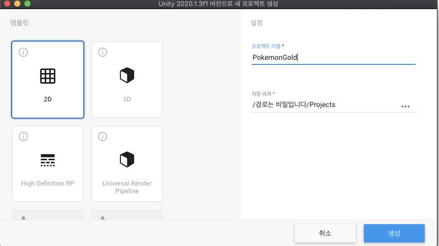 포켓몬 골드버전은 2D 게임이다보니 2D템플릿으로 프로젝트를 만든 뒤