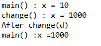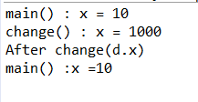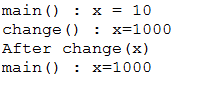 1 2 3 4 5 6 7 8 9 10 11 12 13 14 15 16 17 18 19 20 | package exJava_1; class Data {int x;} public class exTest_1 { public static void main(String[] args) { Data d = new Data(); d.x =10; System.out.println("main() : x = "+ d.x); change(d); System.out.println("After change(d)"); System.out.println("main() :x ="+ d.x ); } static void change(Data d){ d.x = 1000; System.out.println("change() : x = "+ d.x); } } |