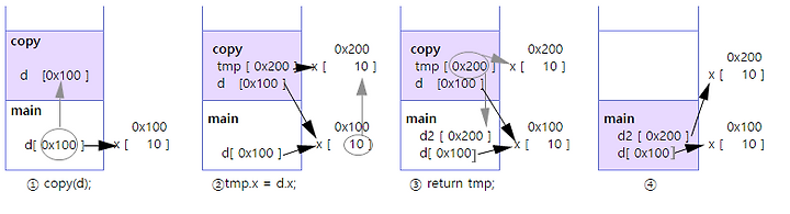 ②새로운 객체를 생성한 다음, d.x에 저장된 값을 tmp.x에 복사한다.