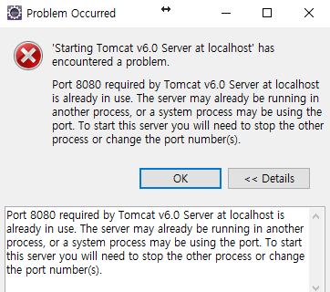같은 포트 사용중이라는 팝업 메세지가 뜬다.